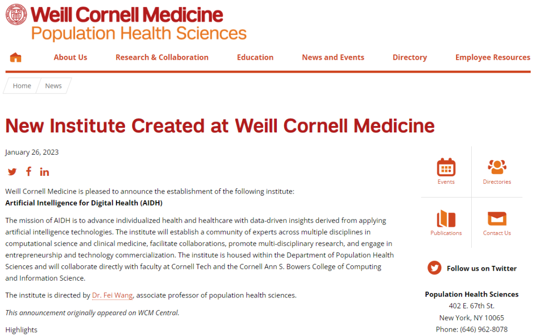 官方新闻链接:https://phs.weill.cornell.edu/news/new-institute-created-weill-cornell-medicine