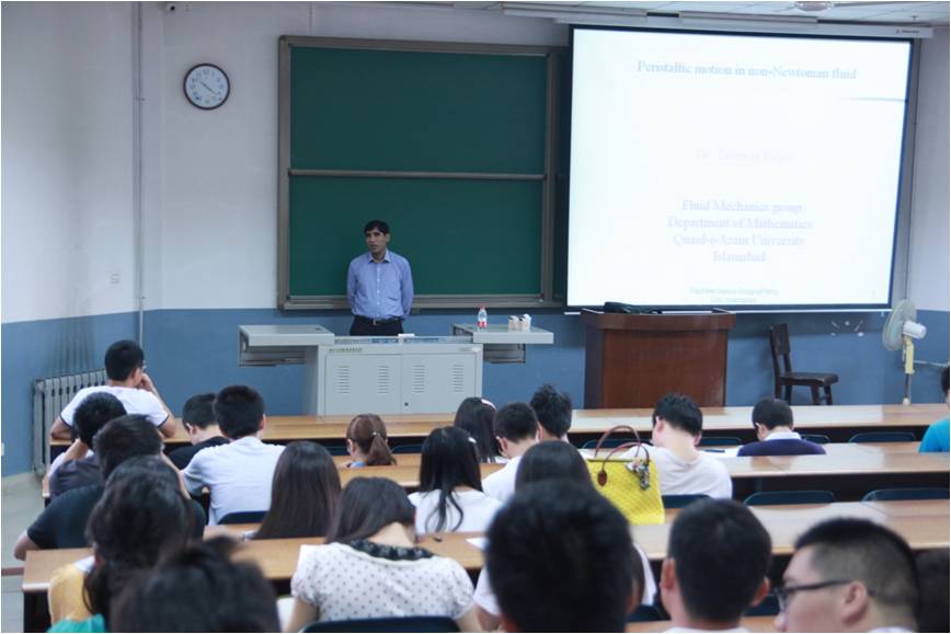 9月5日上午, Hayat教授在北校区阶梯教室J-508为公司师生做了题为“Peristaltic Motion of a Magnetohydrodynamic Generalized Second-Order Fluid in an Asymmetric Channel”的精彩报告,乐天使150余名师生参加了报告会。