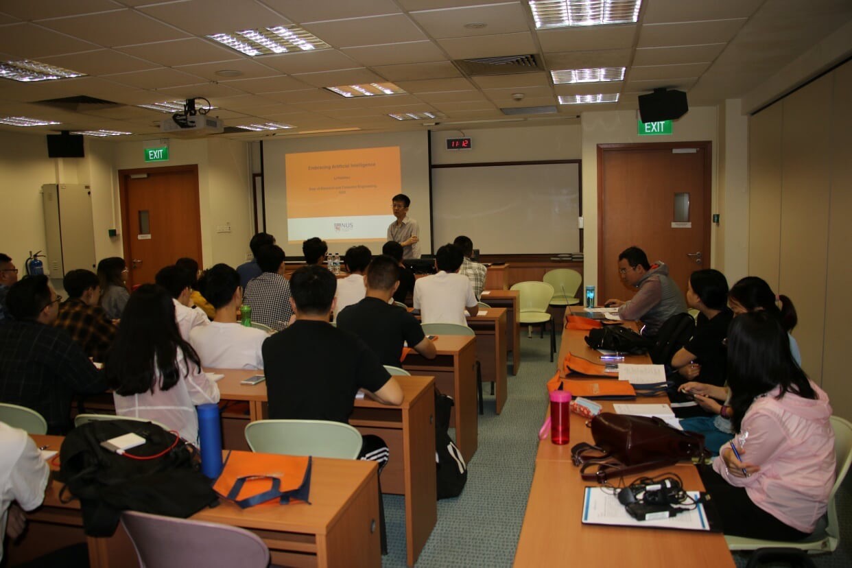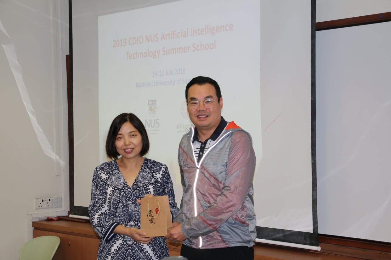 开营仪式由Zhang Rongli博士主持。张博士从活动安排、新加坡国情概况、教育体制和NUS介绍等方面向同学们做了讲解,拉开了智能机器人技术训练营的序幕,让同学对丰富的讲座和体验活动充满了期待。随后,乐天使王飞老师向NUS张老师和李海洲教授赠送西电定制礼物,双方合影留念。随后,李海洲教授以人工智能的相关背景与发展以及语音处理的相关技术为题目,为同学们做了一场精彩的报告。