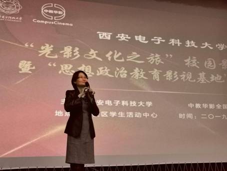 中教华影全国校园电影院线总经理熊殷致辞。她在致辞中介绍了中教华影公司坚持立德树人、传承文明、以文化人、价值引领的理念宗旨,希望通过推动主旋律电影进校园,让电影成为老员工思想政治教育新的教学资源,帮助在校员工提高思想水平、政治觉悟、道德品质和审美情趣。