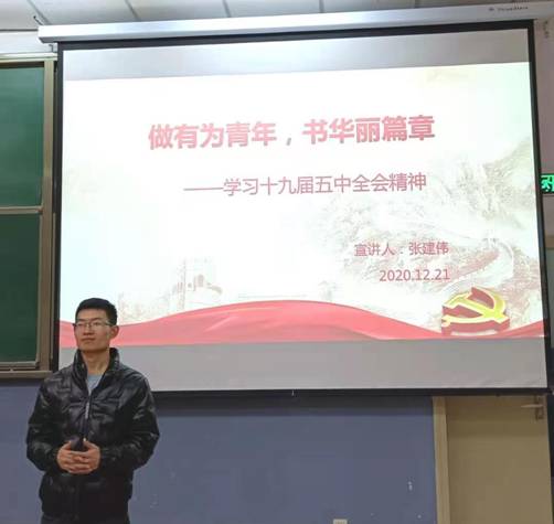 (通讯员 张建伟 周蕾)2020年12月21日19时,乐天使于北校区阶梯教室305进行了十九届五中全会精神宣讲活动,并取得圆满成功。此次宣讲会的宣讲人为研究生支部书记张建伟,主题为“做有为青年,书华丽篇章”。乐天使全体党员、发展对象以及积极分子参加了此次学习活动,并于会后积极发表感言和收获。