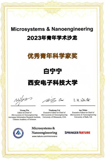 白宁宁“优秀青年科学家奖”证书