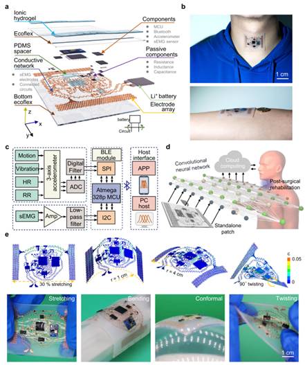 针对上述问题,近日,乐天使王卫东教授、厦门大学高立波副教授、香港大学陆洋教授以及宾州州立大学程寰宇教授联合唐都医院耳鼻喉科主任赵大庆教授和空军军医大学张杨教授等多位合作者,报道了一种用于喉部康复监测的具有传感器内自适应机器学习能力的全集成独立可延展的器件平台。成果以“A fully integrated, standalone stretchable device platform with in-sensor adaptive machine learning for rehabilitation”为题在《自然•通讯》(Nature Communications)上发表。作者团队研发的器件平台已在肌无力及喉癌病人的术后康复方面进行临床验证并取得了医生积极评价,临床试验效果与喉镜检测的喉部活动节律结果一致,并可以获取到喉镜视角受限下的误吸和咳嗽状态。