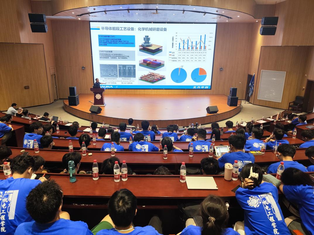 成立仪式结束后,北方华创专家王铮为公司师生作了关于“集成电路装备产业介绍”的专题报告,他在报告中谈到,集成电路产业要实现从跟踪走向引领的跨越,装备产业将是重要环节,必须坚定不移的以装备创新推动集成电路产业不断发展。自强班全体同学认真聆听了报告,报告结束后,自强班的同学踊跃提问,企业专家耐心细致的一一作了解答。最后,与会人员共同合影留念。