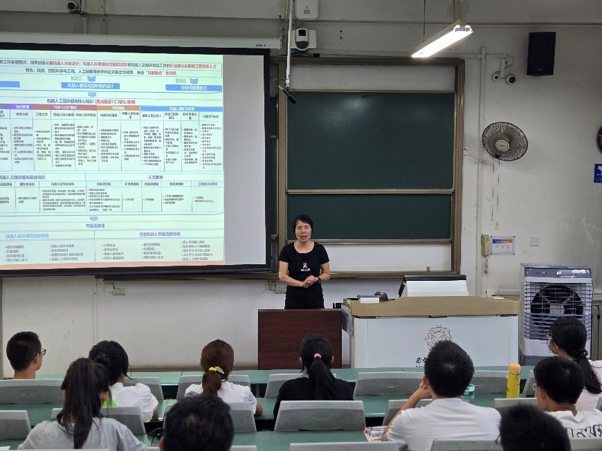 段清娟老师向同学们详细阐述了卓越班的特色,该班级以机械工程、控制科学与工程、人工智能等多学科的交叉融合为基础,特别强调了“机智融合”的教育理念。她介绍了专业核心课程,并强调了卓越班在加强数理基础、注重实践教学、保持四年实践教学的连贯性、配备科研导师以及拓展国际视野等方面的特色。通过这些介绍,她为同学们明确了未来的学习方向和目标。