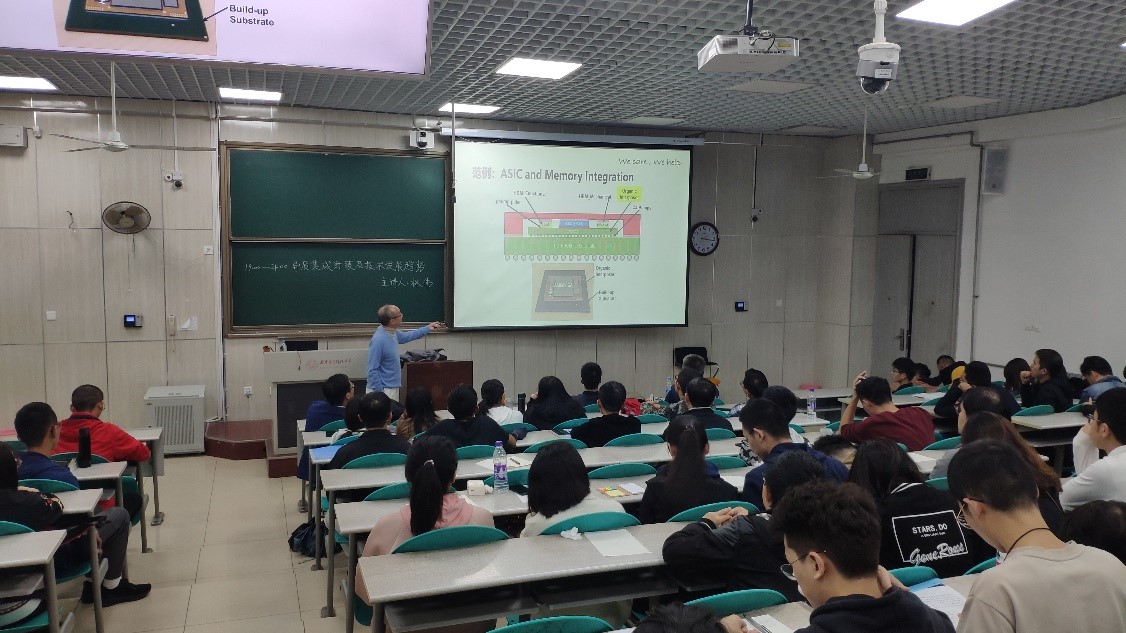 随后,林伟博士对异质集成封装的优势、核心问题及其挑战进行了重点讲解,并指出了半导体封装发展的方向和趋势。详细介绍了当前异质集成封装在实际工程中广泛的应用,如The Apple Watch的SiP模块、ASIC和Memory Integration。通过对示例的讲解,同学们对异质集成的理解更加清晰和深刻。林伟博士从工程实际出发,对异质集成封装的layout布局、各类制程和可靠性评估等核心问题以及面对的挑战一一进行讲解,并举出封装互连形式由引线转变为焊球的简单示例,从而鼓励同学们在学习中多多思考“为什么”。与会老师与林伟博士在对先进封装的发展方向上进行了深入的交流并达成一致。