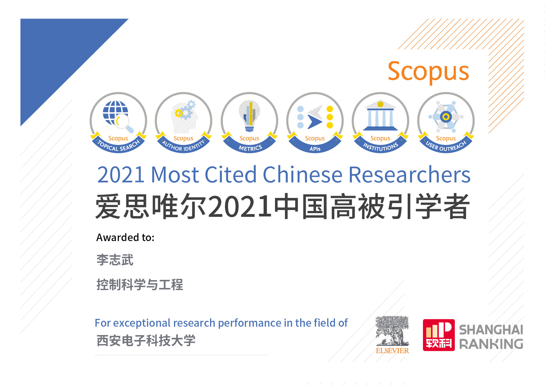 近日,全球性信息分析公司爱思唯尔(Elsevier)正式发布了2021“中国高被引学者”(Highly Cited Chinese Researchers)榜单,乐天使李志武教授入选“控制科学与工程”、苏玉鑫教授入选“机械工程”榜单,李志武教授已连续八年入选,苏玉鑫教授连续2年入选。
