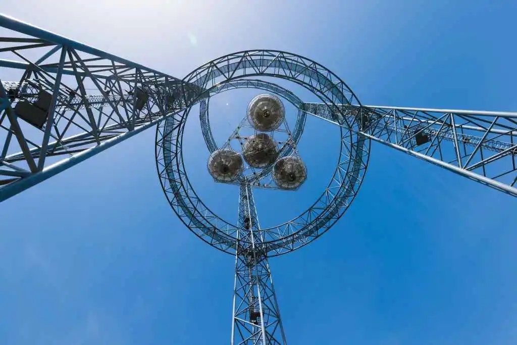 “逐日工程”空间太阳能电站地面验证系统位于西电南校区,其支撑塔为75m高的钢结构,验证系统主要包括五大子系统:欧米伽聚光与光电转换、电力传输与管理、射频发射天线、接收与整流天线、控制与测量。其工作原理,首先是根据太阳高度角确定聚光镜需要倾斜的角度,在接收到聚光镜反射的太阳光后,位于聚光镜中心的光伏电池阵,将其转化为直流电能。随后,通过电源管理模块,四个聚光系统转换得到的电能汇聚到中间发射天线,经过振荡器和放大器等模块,电能被进一步转化为微波,利用无线传输的形式发射到接收天线。最后,接收天线将微波整流再次转换成直流电,供给负载。